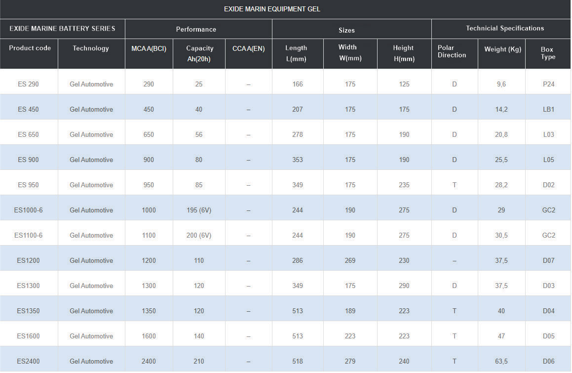 Exide's EQUIPMENT GEL battery series is designed for boats and caravans with special battery packs for navigation, emergencies, safety and comfort. Batteries are partially or completely discharged during use. The special design of EQUIPMENT GEL, combined with a good charging procedure, ensures reliable performance and excellent service life. EQUIPMENT GEL series has a performance of 290-2400Wh. Covering all your equipment supply needs, from small electronics to emergency power.