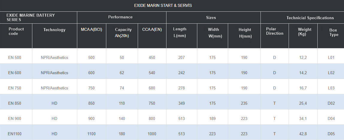 The Exide START battery series provides high power for engine starting. It is installed alone on boats with basic equipment and is also used in engine-specific battery banks on sophisticated yachts. Batteries are usually charged after the engine has been started because the alternator quickly restores the consumed power. START design ensures good performance and service life. With 500-1100A MCA* performance, the START battery series is the ideal choice to meet all engine starting needs, from small outboards to large sterndrives.